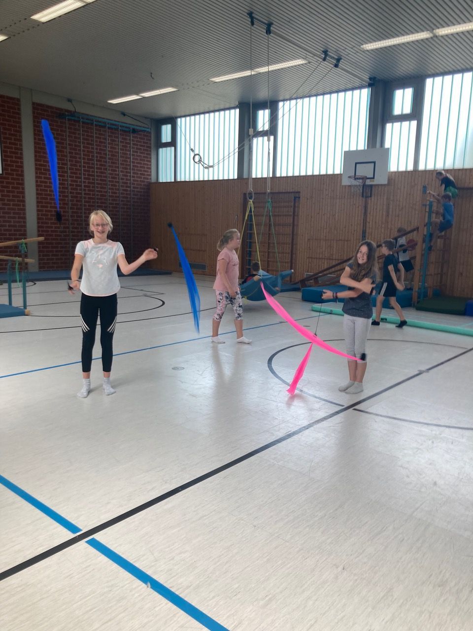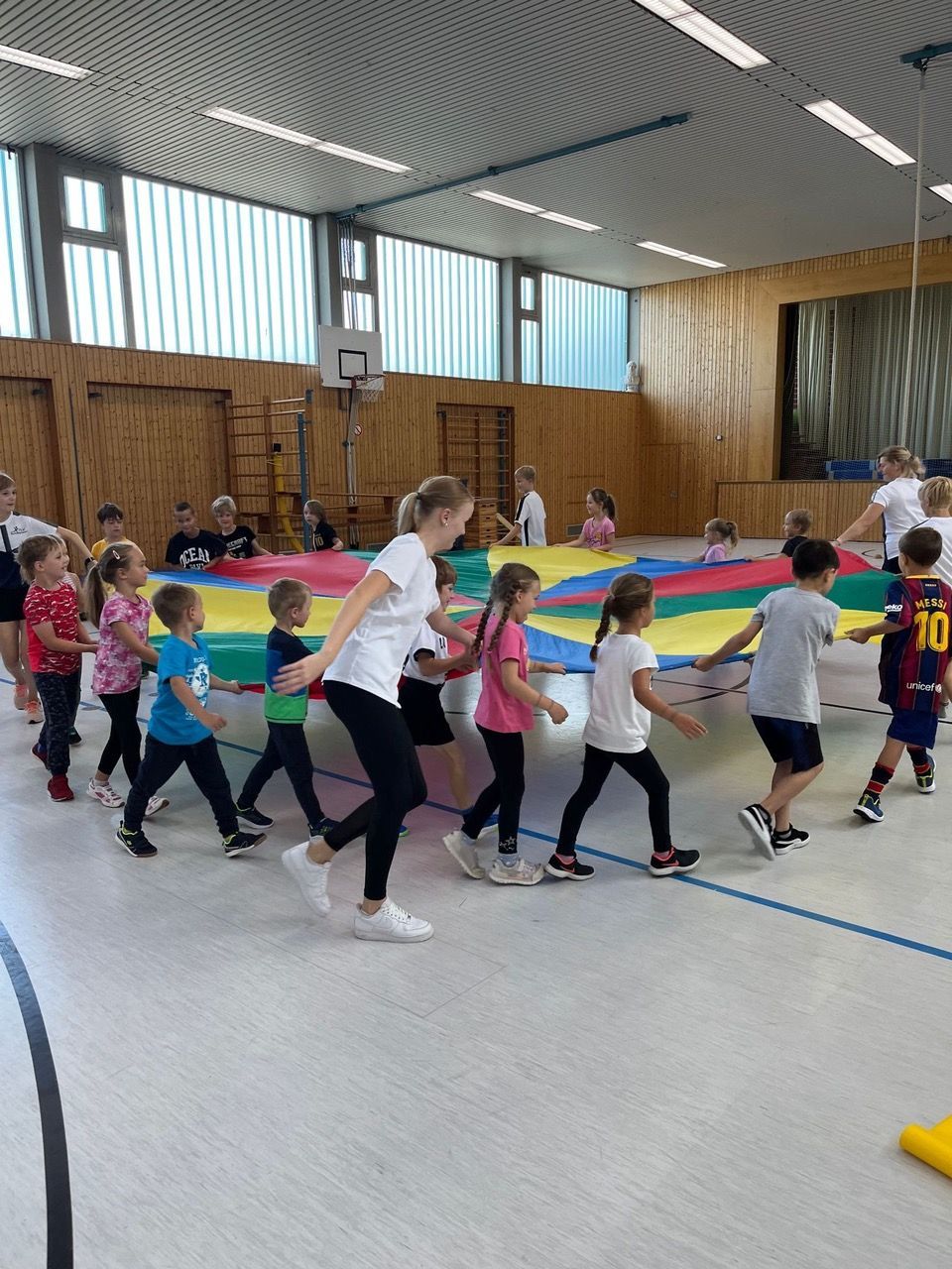 Unter der Anleitung von Katrin Kehl und Katrin Knöferl und den Helfern Basti, Philipp, Julia und Hannah gab es ein kleines Aufwärmprogramm mit dem Schwungtuch und zum Abschluss das Feuer-Wasser-Sturm Spiel.