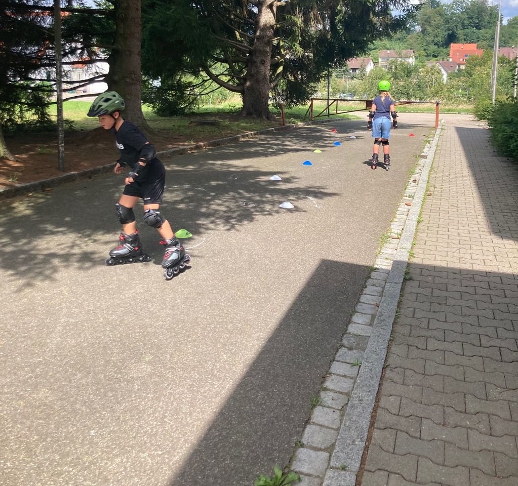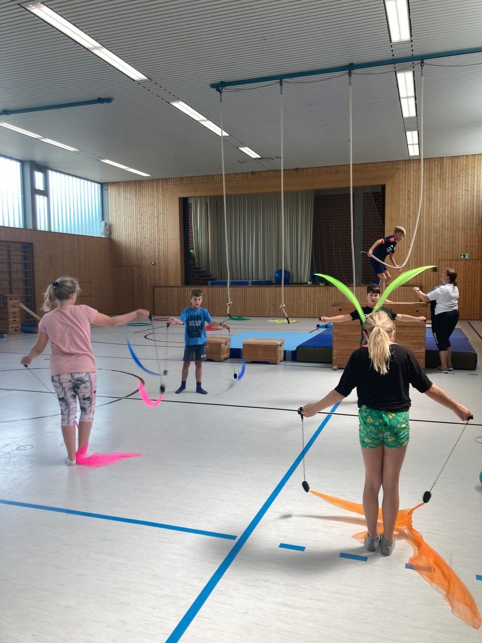 Die älteren Kinder ab 9 konnten den Parkour draußen mit Inlineskates erkunden und sich in der Halle auf X-Slidern ausprobieren. Viel Spaß machte das Schwingen an den Seilen mit Aufsammeln von Gegenständen. Auch beim Schwingen mit den Poi konnten ganz neue Erfahrungen gesammelt werden.