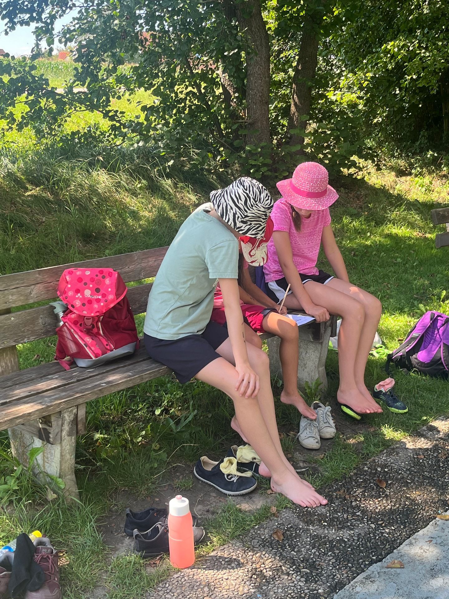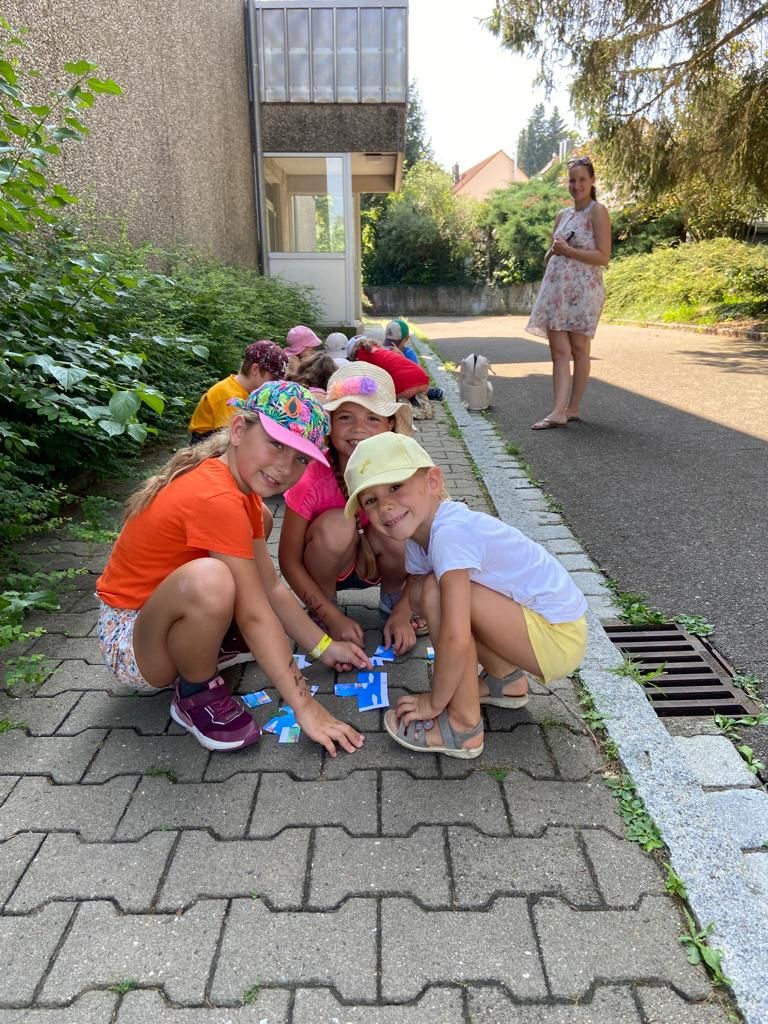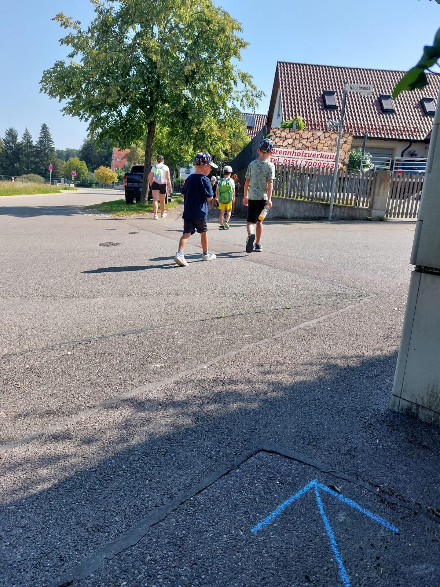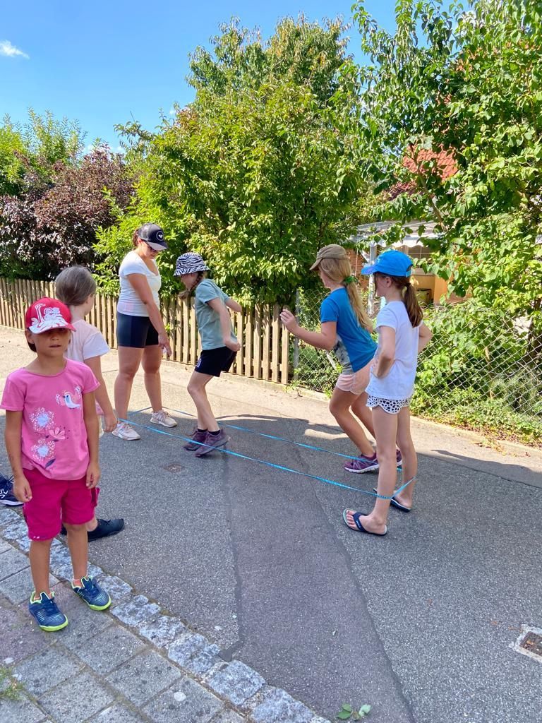 Bei fast 35 Grad folgten die Teilnehmer den Pfeilen und freuten sich wahnsinnig über die ersehnte Abkühlung. Mit einem Becher-Schütt-Wettbewerb im Kneipbecken kam ein lustiger Wettkampfcharakter auf. Nach dem Lösen eines Kreuzworträtsels und dem Folgen der Pfeile auf dem Weg gelangten die Kinder durch einen weiteren Fußmarsch zur letzten Übungsstation, dem „Gummi-Twist“. In einer Seitenstraße hinter dem Spielplatz studierten die Kinder lustige Hüpfsprüche ein, die den letzten Teil ihres Haut-Tattoos ergaben. Die Lösung eines Buchstabensalates führte die Kinder zum Spielplatz, wo Sie die verdiente Belohnung, ein Eis, erwartete.