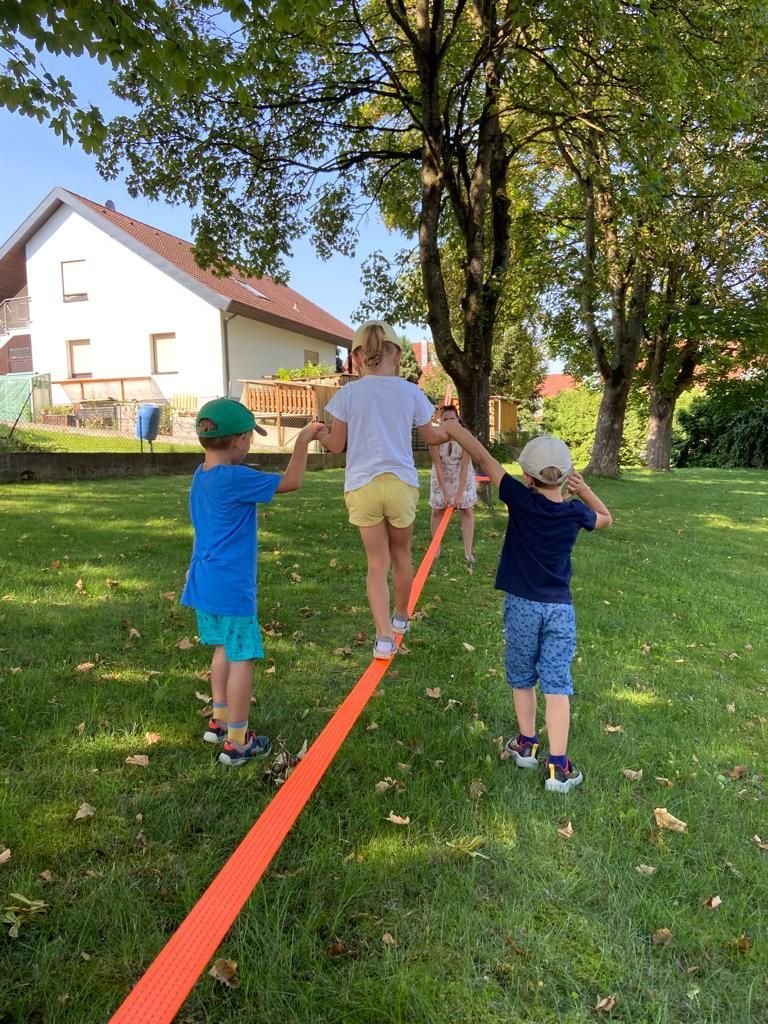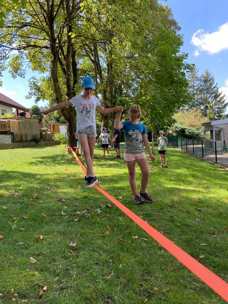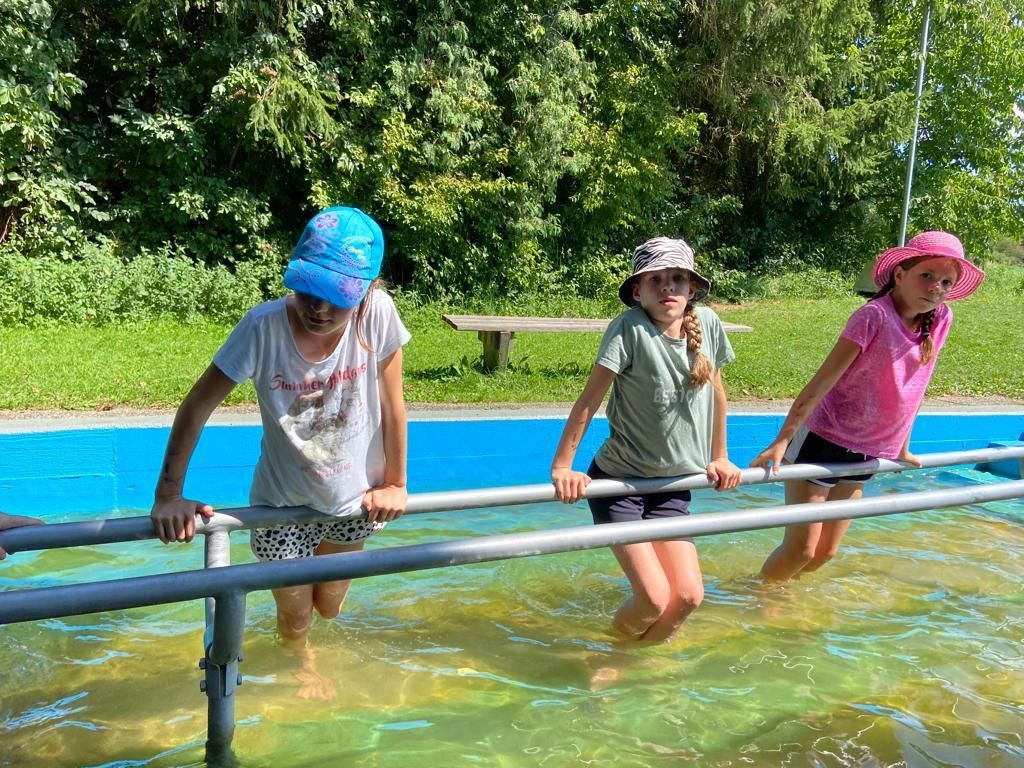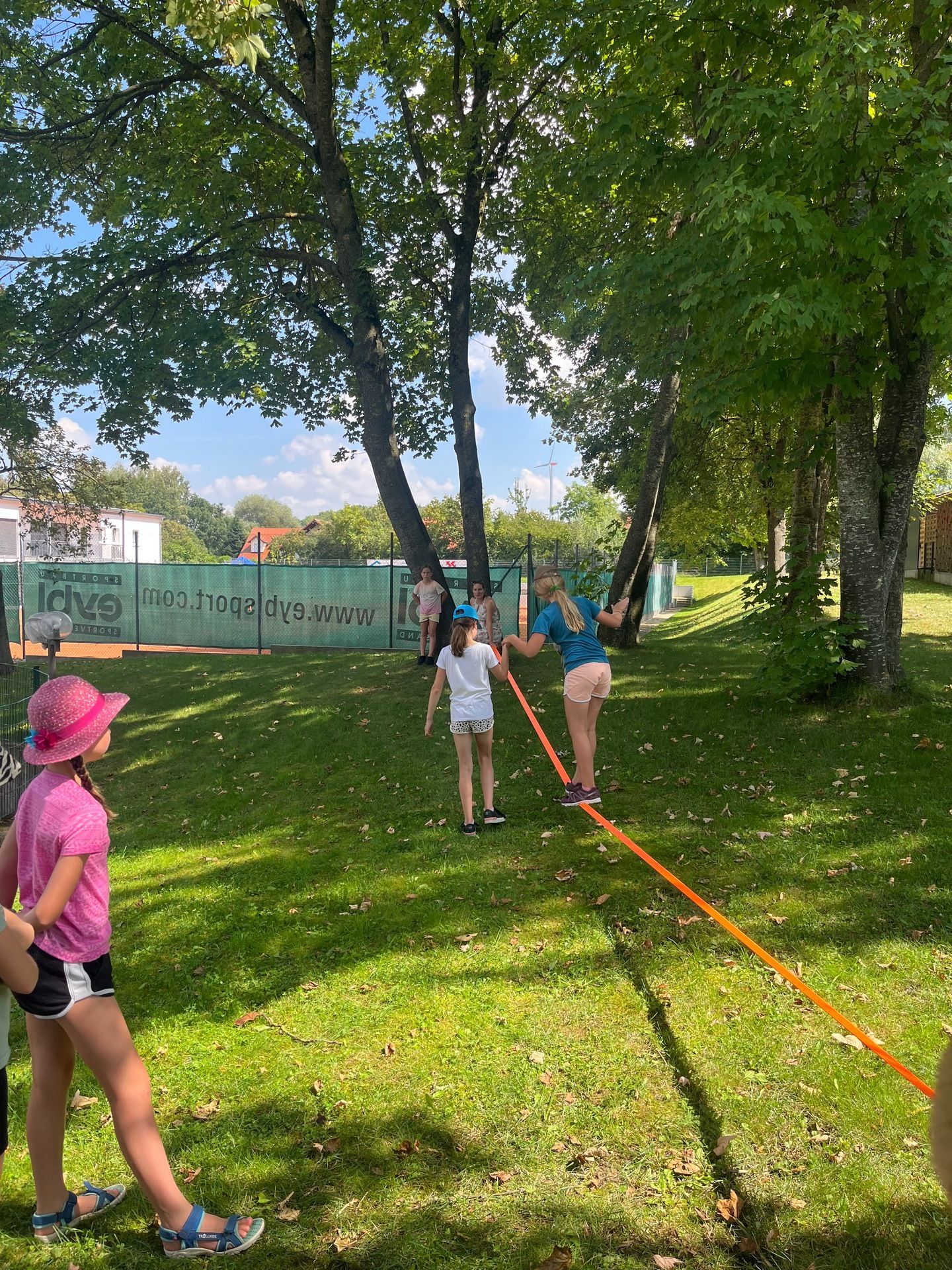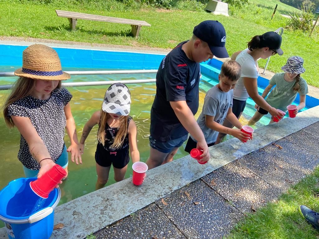 Bei fast 35 Grad folgten die Teilnehmer den Pfeilen und freuten sich wahnsinnig über die ersehnte Abkühlung. Mit einem Becher-Schütt-Wettbewerb im Kneipbecken kam ein lustiger Wettkampfcharakter auf. Nach dem Lösen eines Kreuzworträtsels und dem Folgen der Pfeile auf dem Weg gelangten die Kinder durch einen weiteren Fußmarsch zur letzten Übungsstation, dem „Gummi-Twist“. In einer Seitenstraße hinter dem Spielplatz studierten die Kinder lustige Hüpfsprüche ein, die den letzten Teil ihres Haut-Tattoos ergaben. Die Lösung eines Buchstabensalates führte die Kinder zum Spielplatz, wo Sie die verdiente Belohnung, ein Eis, erwartete.