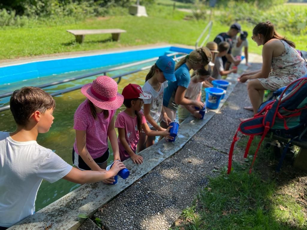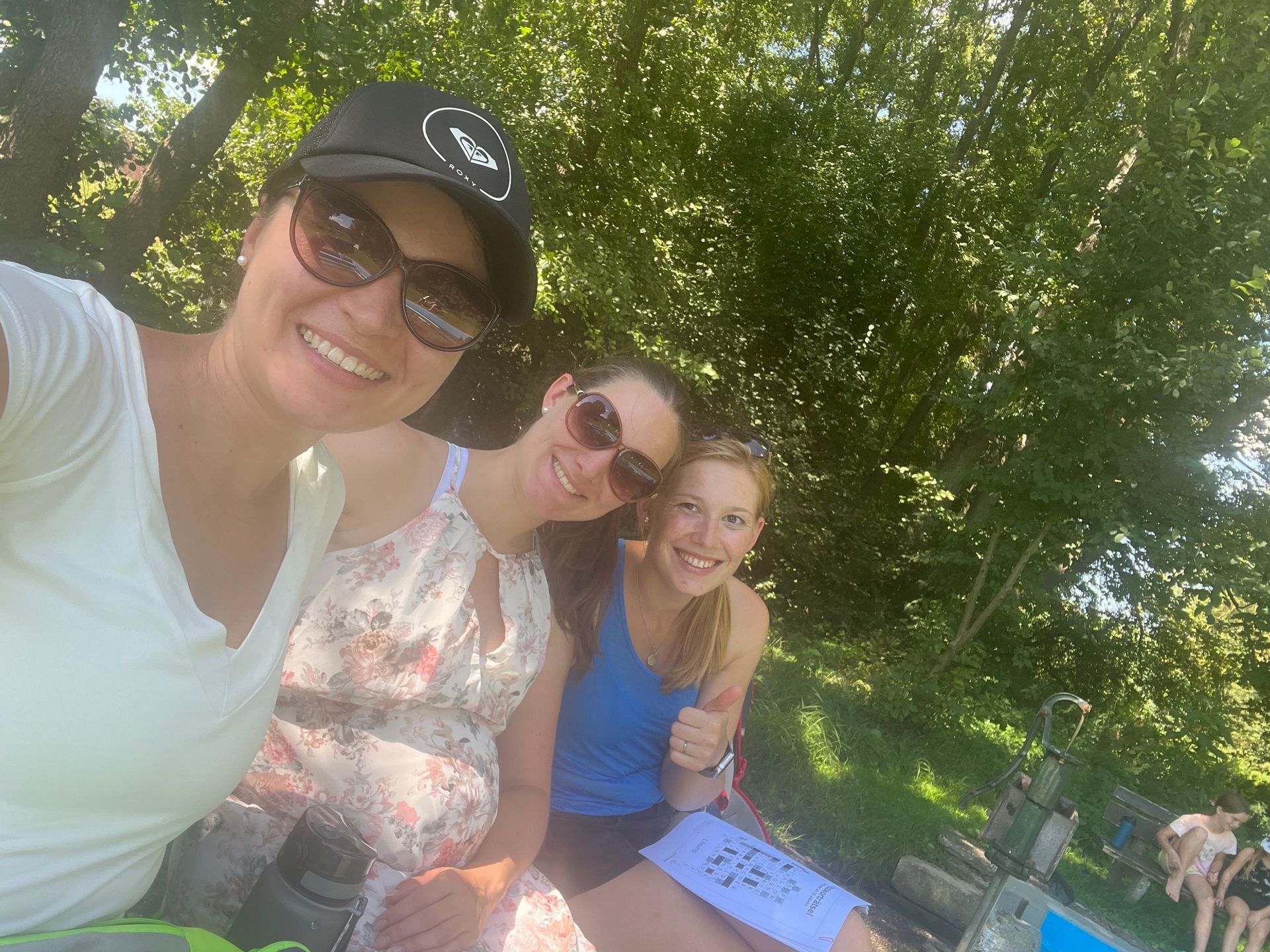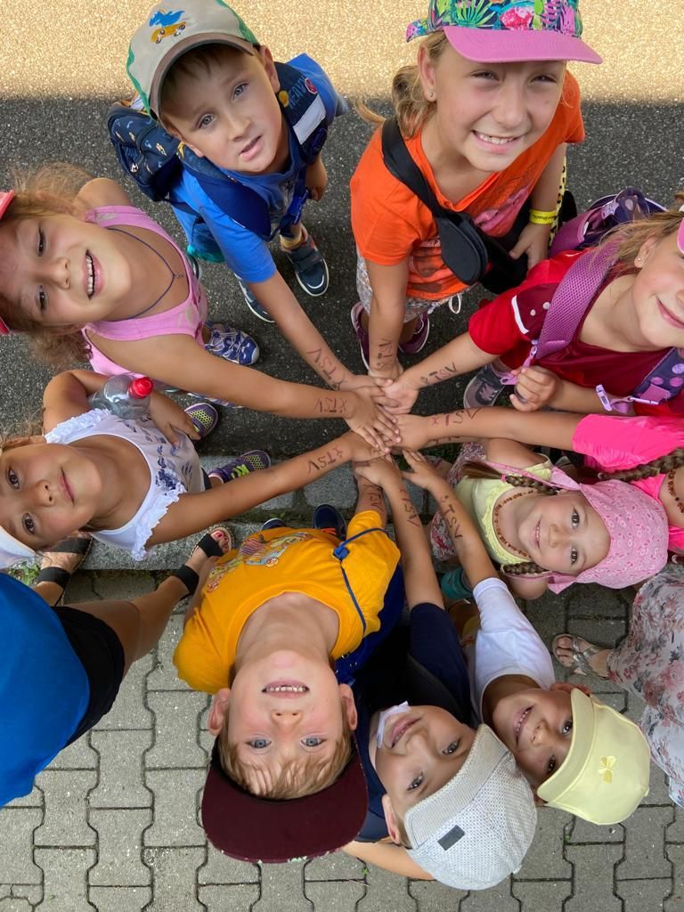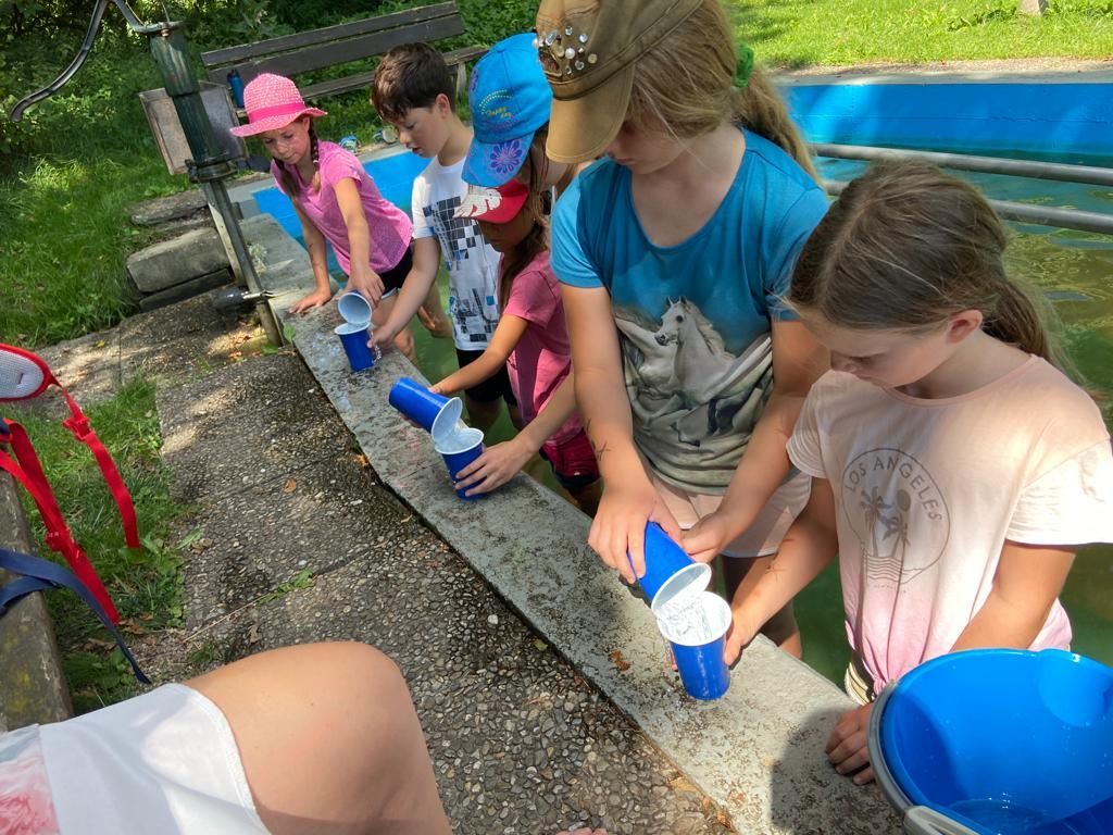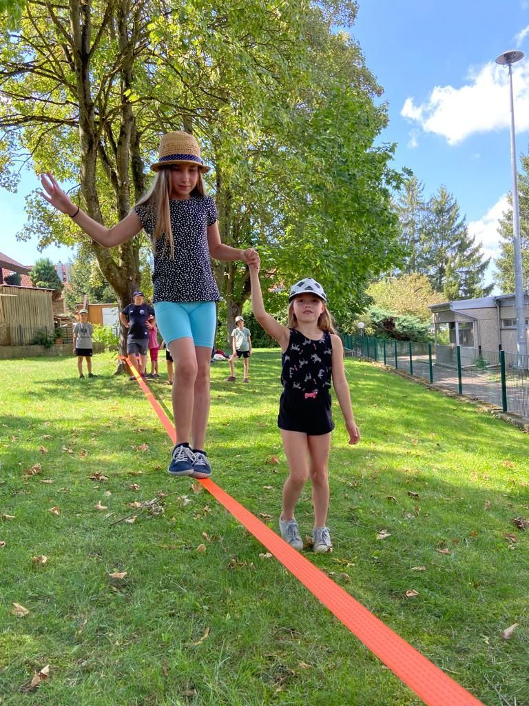 Bei fast 35 Grad folgten die Teilnehmer den Pfeilen und freuten sich wahnsinnig über die ersehnte Abkühlung. Mit einem Becher-Schütt-Wettbewerb im Kneipbecken kam ein lustiger Wettkampfcharakter auf. Nach dem Lösen eines Kreuzworträtsels und dem Folgen der Pfeile auf dem Weg gelangten die Kinder durch einen weiteren Fußmarsch zur letzten Übungsstation, dem „Gummi-Twist“. In einer Seitenstraße hinter dem Spielplatz studierten die Kinder lustige Hüpfsprüche ein, die den letzten Teil ihres Haut-Tattoos ergaben. Die Lösung eines Buchstabensalates führte die Kinder zum Spielplatz, wo Sie die verdiente Belohnung, ein Eis, erwartete.