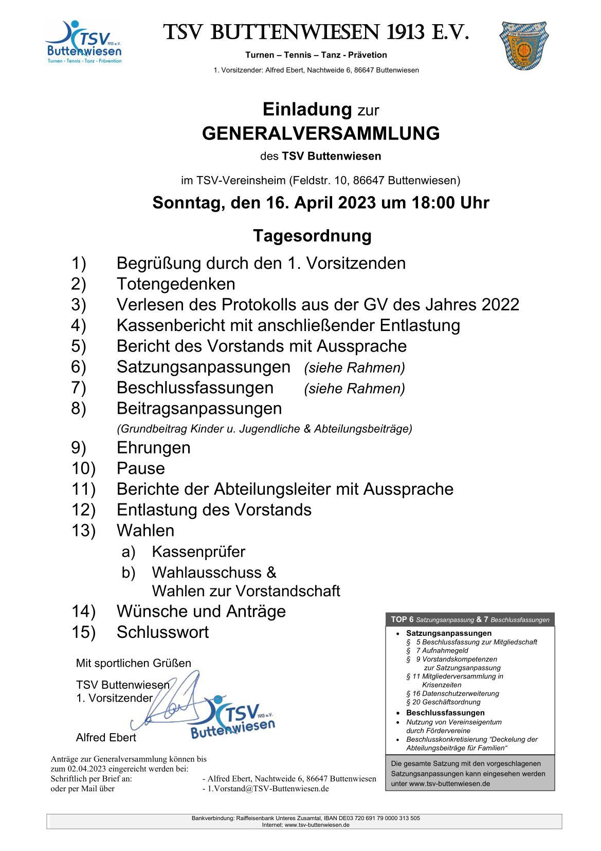 Themen zu denen Ihr eine Beschlussfassung wünscht, sendet Ihr bitte per Mail an den 1. Vorstand unter der Mailadresse: 1.Vorstand@TSV-Buttenwiesen.de