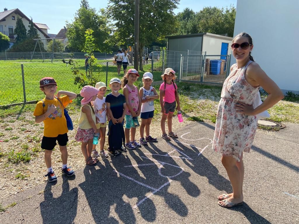Bei fast 35 Grad folgten die Teilnehmer den Pfeilen und freuten sich wahnsinnig über die ersehnte Abkühlung. Mit einem Becher-Schütt-Wettbewerb im Kneipbecken kam ein lustiger Wettkampfcharakter auf. Nach dem Lösen eines Kreuzworträtsels und dem Folgen der Pfeile auf dem Weg gelangten die Kinder durch einen weiteren Fußmarsch zur letzten Übungsstation, dem „Gummi-Twist“. In einer Seitenstraße hinter dem Spielplatz studierten die Kinder lustige Hüpfsprüche ein, die den letzten Teil ihres Haut-Tattoos ergaben. Die Lösung eines Buchstabensalates führte die Kinder zum Spielplatz, wo Sie die verdiente Belohnung, ein Eis, erwartete.